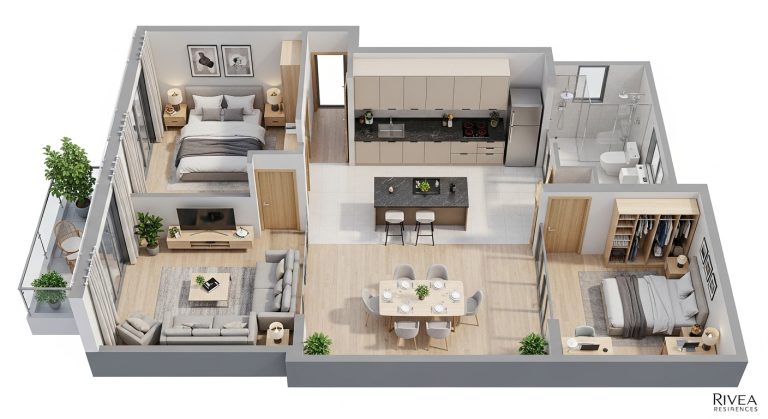 Cho thuê căn hộ 2 phòng ngủ + Meyhome Rivea Hà Nội đang được nhiều gia đình trẻ và chuyên gia lựa chọn nhờ sự linh hoạt trong thiết kế và công năng sử dụng. Không gian 2PN+ cho phép bố trí thêm khu vực làm việc, phòng cho bé hoặc kho nhỏ, mang đến sự tiện nghi vượt trội trong tầm diện tích hợp lý.