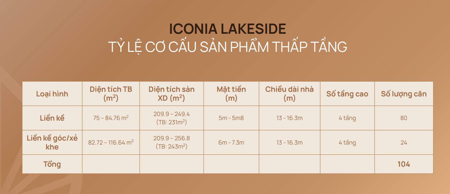 - Giá bán thấp tầng liền kề Iconia Lakeside: [Đang cập nhật]