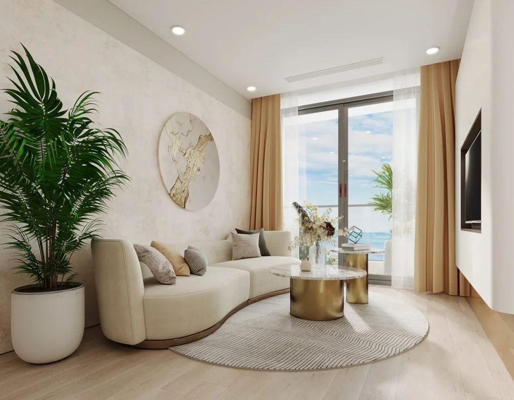 Căn hộ 1 phòng ngủ +1 có diện tích khoảng 55–65m², bố trí thêm không gian phụ có thể làm phòng làm việc hoặc phòng ngủ nhỏ. Thiết kế mở, ban công rộng hướng biển giúp gia chủ tận hưởng trọn vẹn không khí trong lành và ánh sáng tự nhiên.