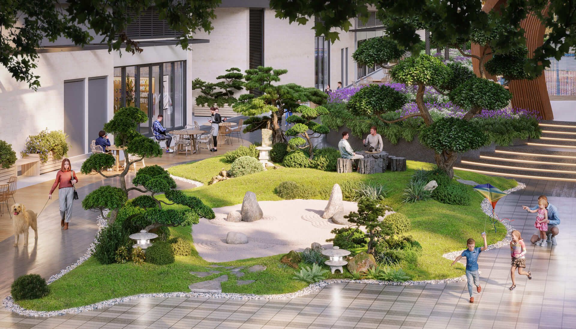 Mật độ xây dựng thấp giúp Meypearl Harmony Phú Quốc dành phần lớn diện tích cho không gian cảnh quan: vườn nhiệt đới, hồ cảnh quan trung tâm, đường dạo bộ phủ cây xanh, cùng vườn thiền và khu BBQ ngoài trời – nơi kết nối gia đình và cộng đồng.