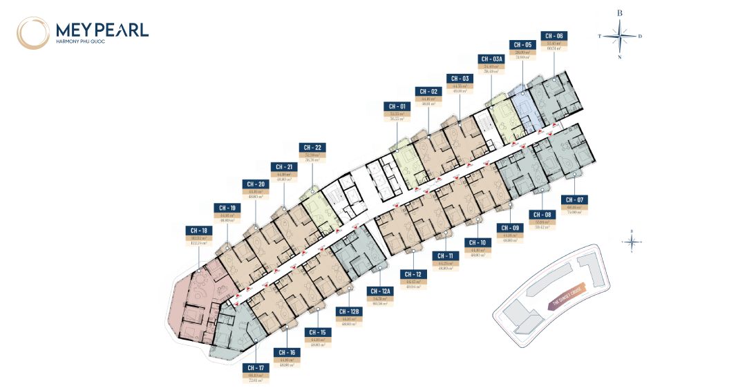 Mặt bằng thiết kế Meypearl Harmony Phú Quốc được nghiên cứu kỹ lưỡng để tối ưu công năng và gia tăng trải nghiệm sống cho từng cư dân. Các căn hộ được bố trí hợp lý, đảm bảo mọi không gian đều có ánh sáng và thông gió tự nhiên, mang lại cảm giác thoáng đãng và gắn kết với thiên nhiên biển đảo.
