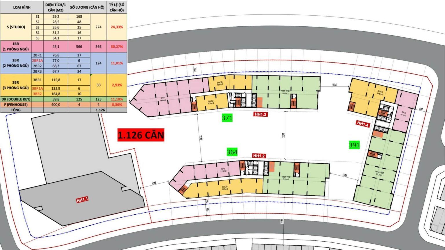 Số lượng căn hộ: 1.115 căn (Studio, 1PN, 2PN, 3PN)