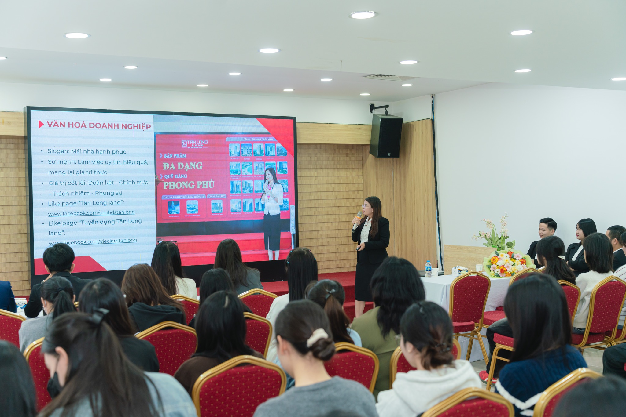 Tại Phòng Đào tạo Tân Long, chương trình bắt đầu trong bầu không khí hào hứng và truyền cảm hứng. Đại diện Tân Long Land đã chia sẻ những nội dung giá trị xoay quanh: