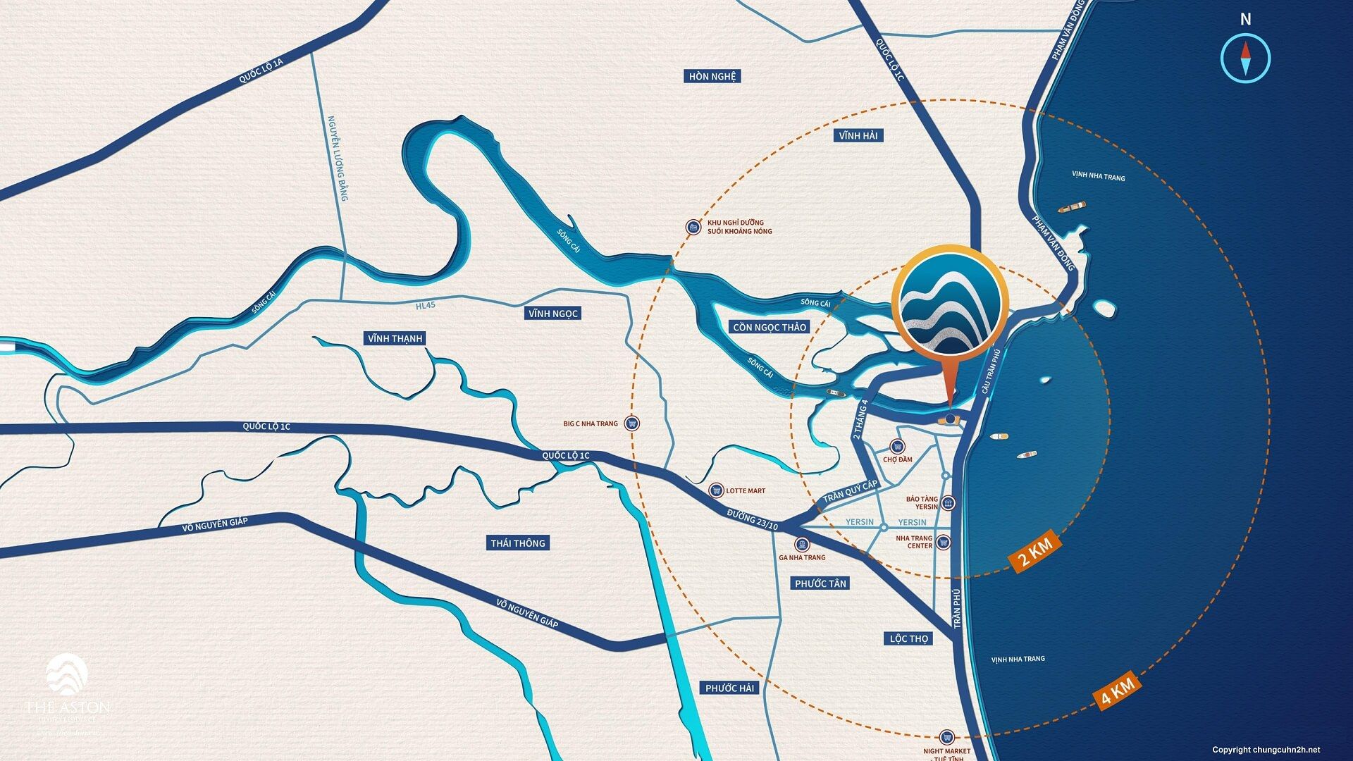 Chung cư Welltone Luxury Residence (tên gọi trước đây là The Aston) sở hữu vị trí hiếm có tại khu vực chân cầu Trần Phú, trên trục đường Xóm Cồn, phường Xương Huân, TP. Nha Trang. Dự án nằm ngay mặt tiền sông Cái, đồng thời tiếp giáp đường Trần Phú – tuyến đường ven biển sầm uất bậc nhất thành phố, mang đến tầm nhìn khoáng đạt hướng biển, sông và toàn cảnh đô thị. Từ đây, cư dân dễ dàng kết nối nhanh đến trung tâm, bãi biển và các khu vực trọng điểm lân cận.